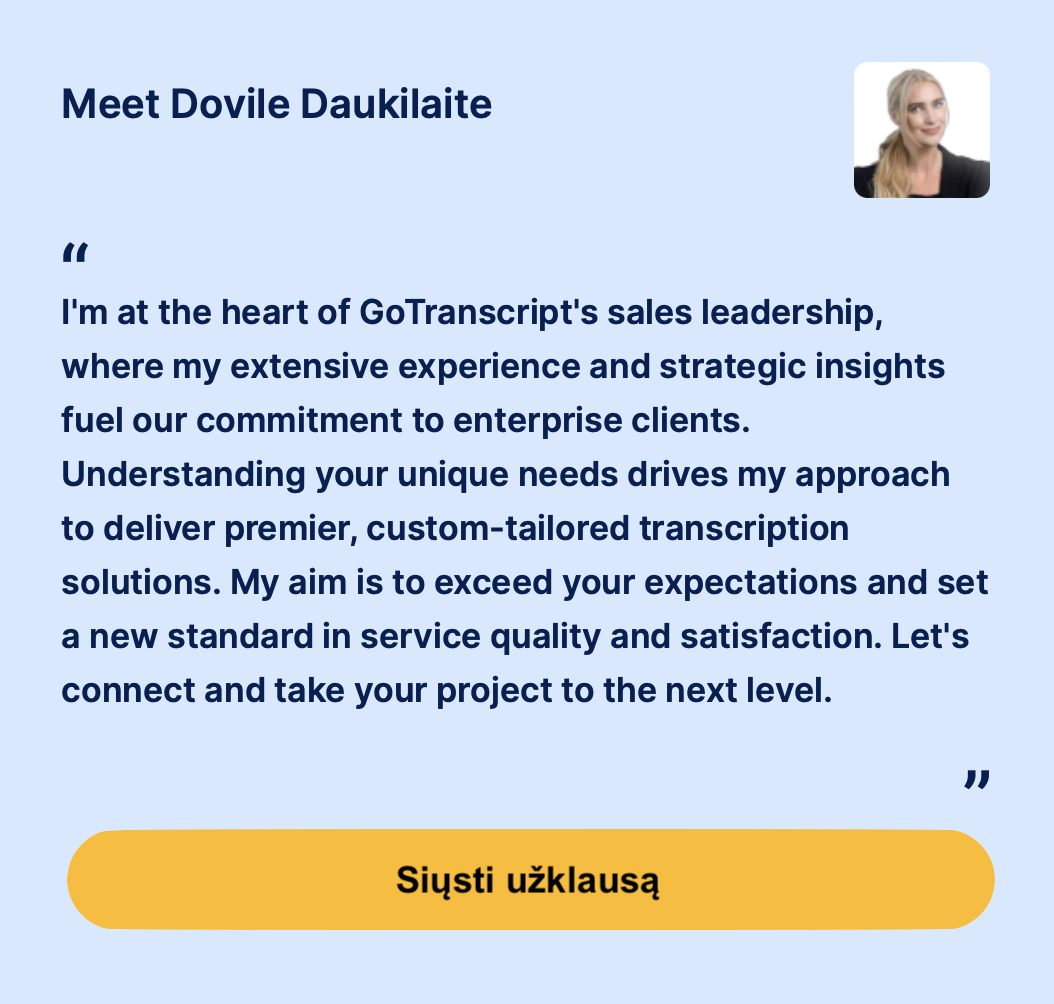 GoTranscript siūlo modernias transkribavimo, titravimo ir vertimo paslaugas, kurios atitinka šiuolaikinių vartotojų poreikius. Jei jums reikia patikimų ir kokybiškų sprendimų, GoTranscript gali padėti – nuo kainų iki paslaugų patogumo. Sužinokite daugiau apie galimybes ir užsisakykite paslaugas neišeidami iš namų.