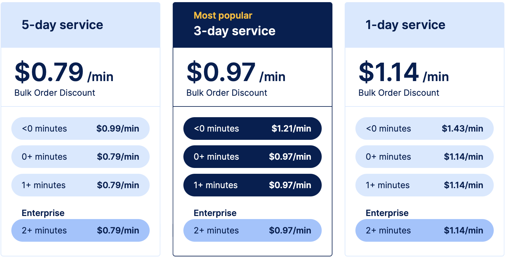 GoTranscript siūlo konkurencingą transkribavimo kainodarą nuo $0.84 už minutę. Pirkėjams siūlomos nuolaidos: